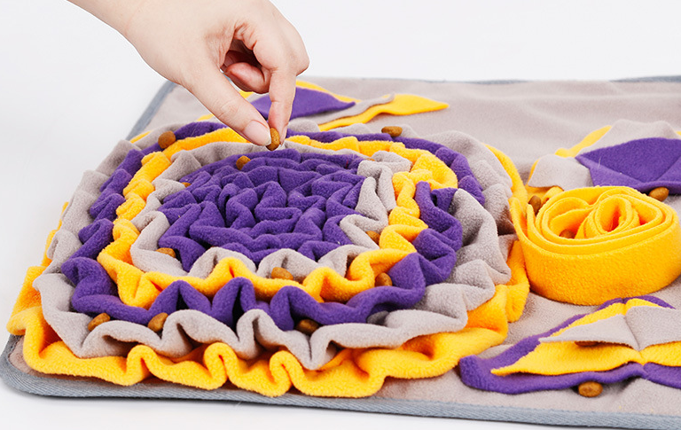 Alfombra snuffle interactiva diseñada para perros y gatos, ideal para estimular su mente y reducir el estrés. Permite ocultar golosinas o croquetas entre sus pliegues, fomentando la búsqueda mediante el olfato y promoviendo una alimentación más lenta y saludable.