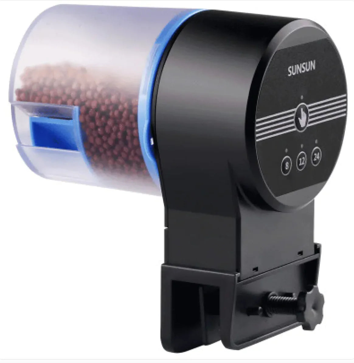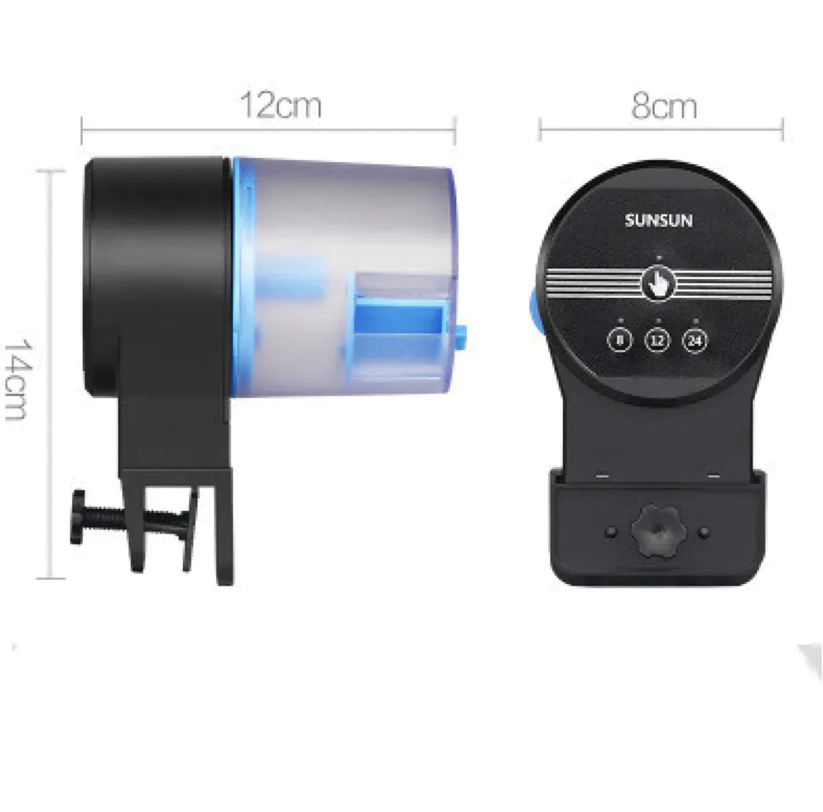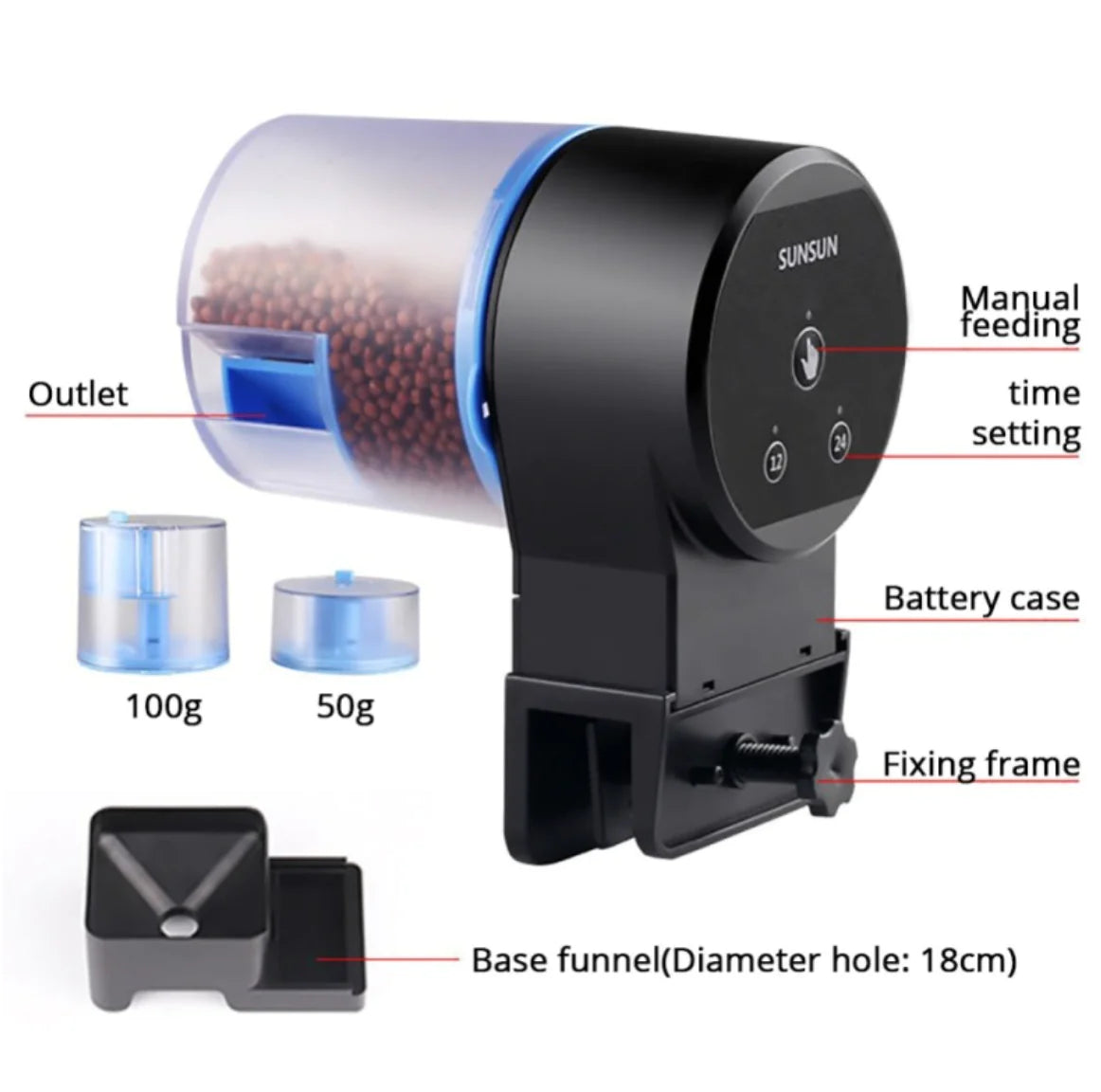 Alimentador de acuario, diseñado para alimentación automática o manual de peces, fácil de usar con horarios de alimentación ajustables, adecuado para todo tipo de alimentos para peces, garantiza una alimentación constante mientras mantiene un ambiente de tanque saludable, ideal para tanques de agua dulce y salada, puede contener una gran cantidad de comida durante períodos prolongados, duradero y resistente a la humedad para evitar la aglomeración de alimentos, perfecto para propietarios de acuarios ocupados, asegura que sus peces sean alimentados incluso cuando no está