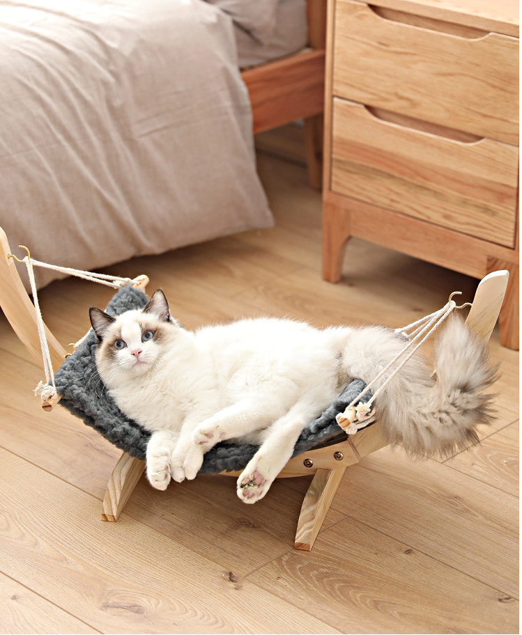 Transforma el tiempo de descanso de tu mascota con nuestra exquisita hamaca para gatos. Elaborada con materiales de primera calidad como la madera, la lona y el terciopelo, esta hamaca ofrece un refugio acogedor y estiloso para tu amigo felino.