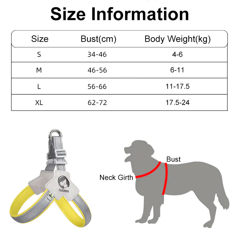 El arnés está disponible en una variedad de tallas, desde la S hasta la XL, para diferentes razas y pesos. Ya sea que tu perro pese entre 4 y 24 kg, encontrarás el arnés perfecto.