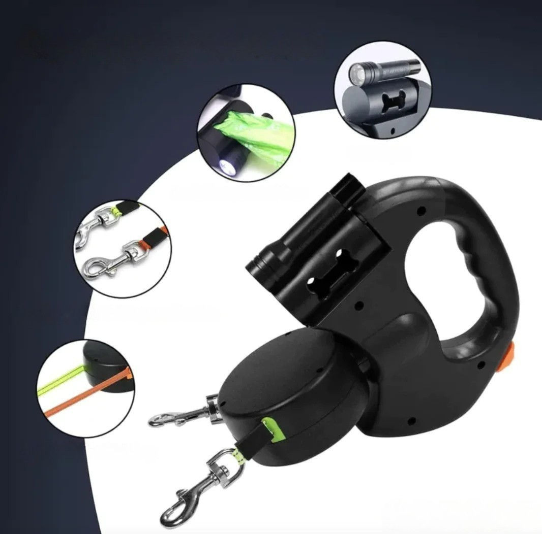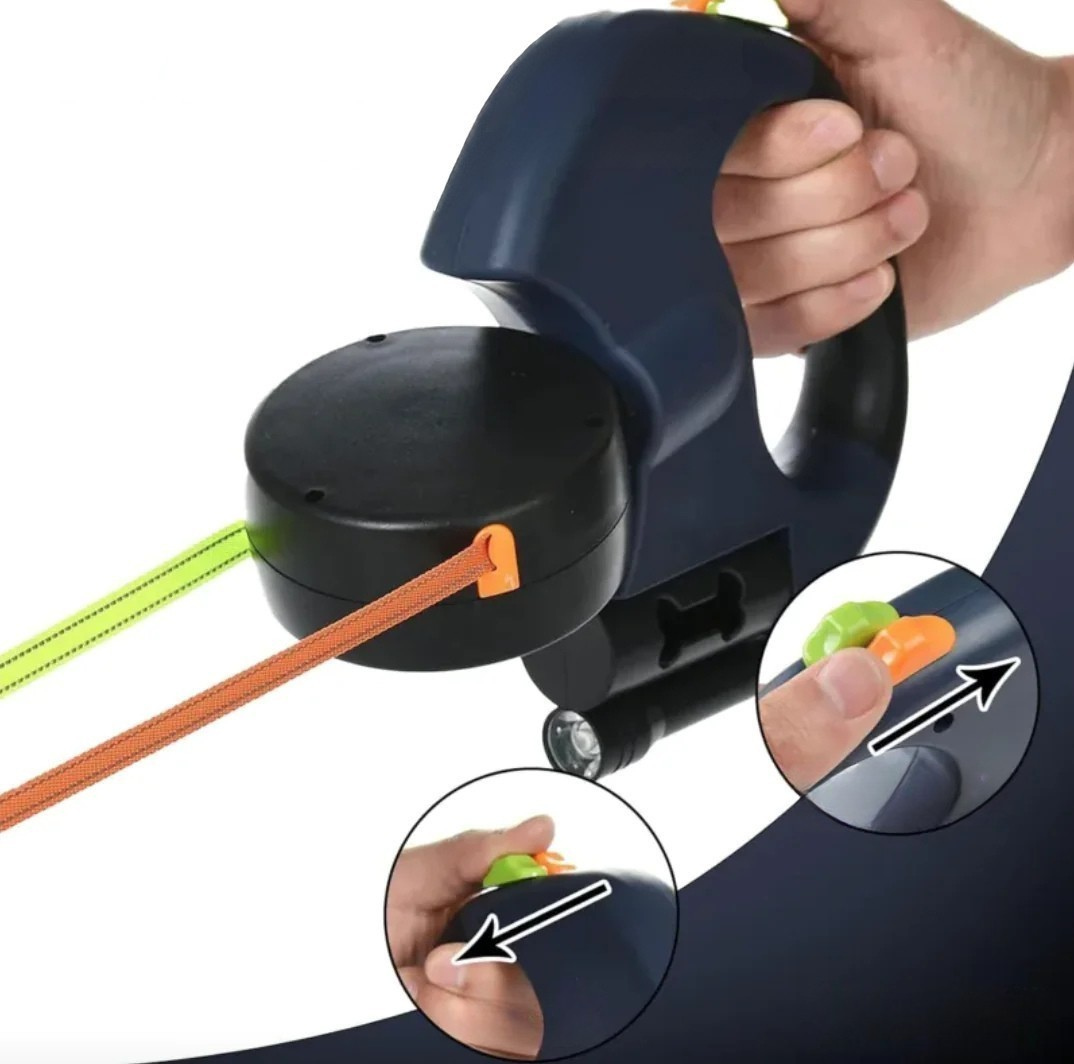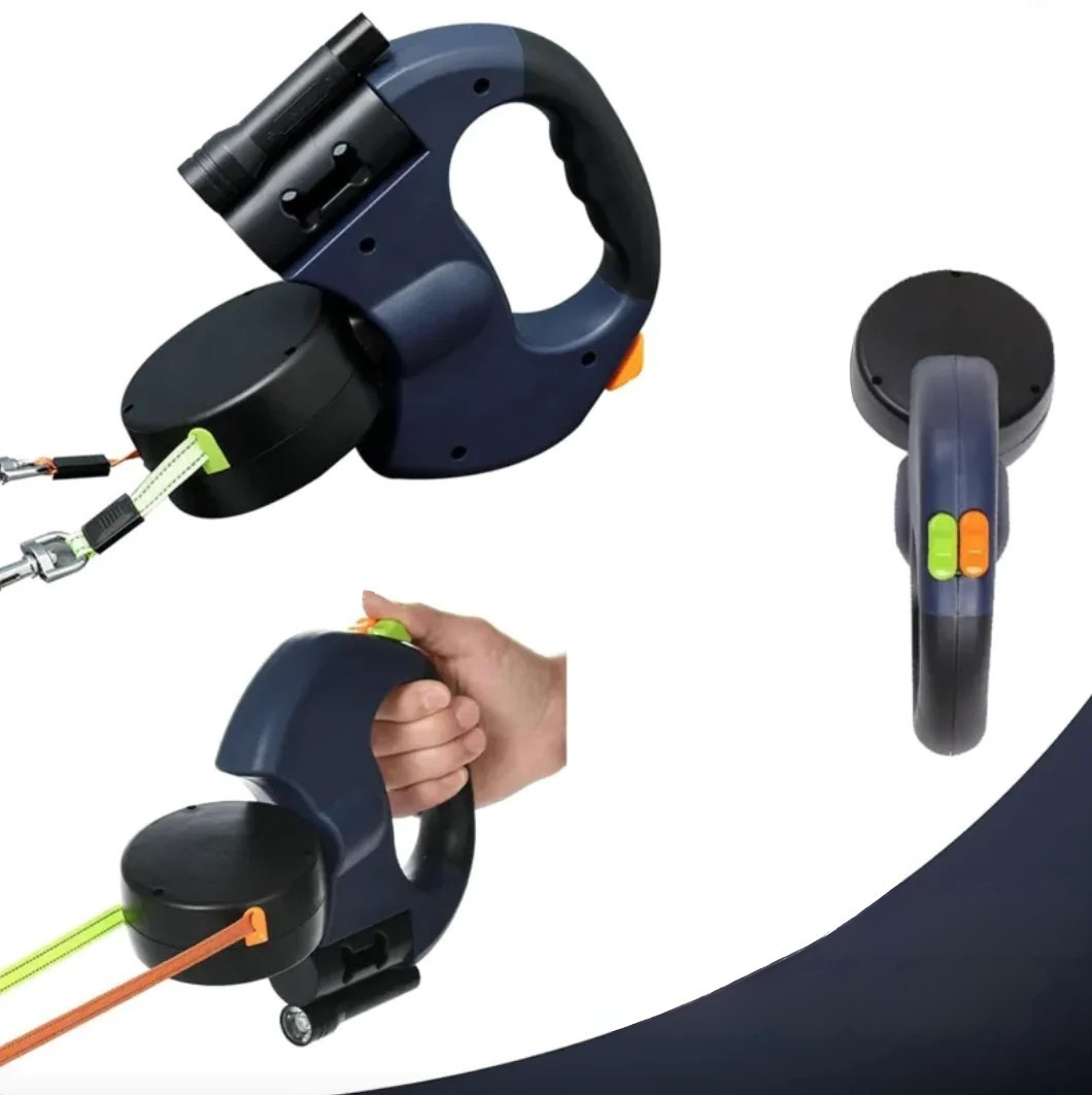 Pasea a dos perros al mismo tiempo sin enredos gracias a su diseño retráctil con rotación de 360°. Incorpora un práctico sistema de control con un solo botón, que permite bloquear o liberar las correas fácilmente. Ideal para paseos cómodos y seguros. Pequeña linterna para Iluminación.